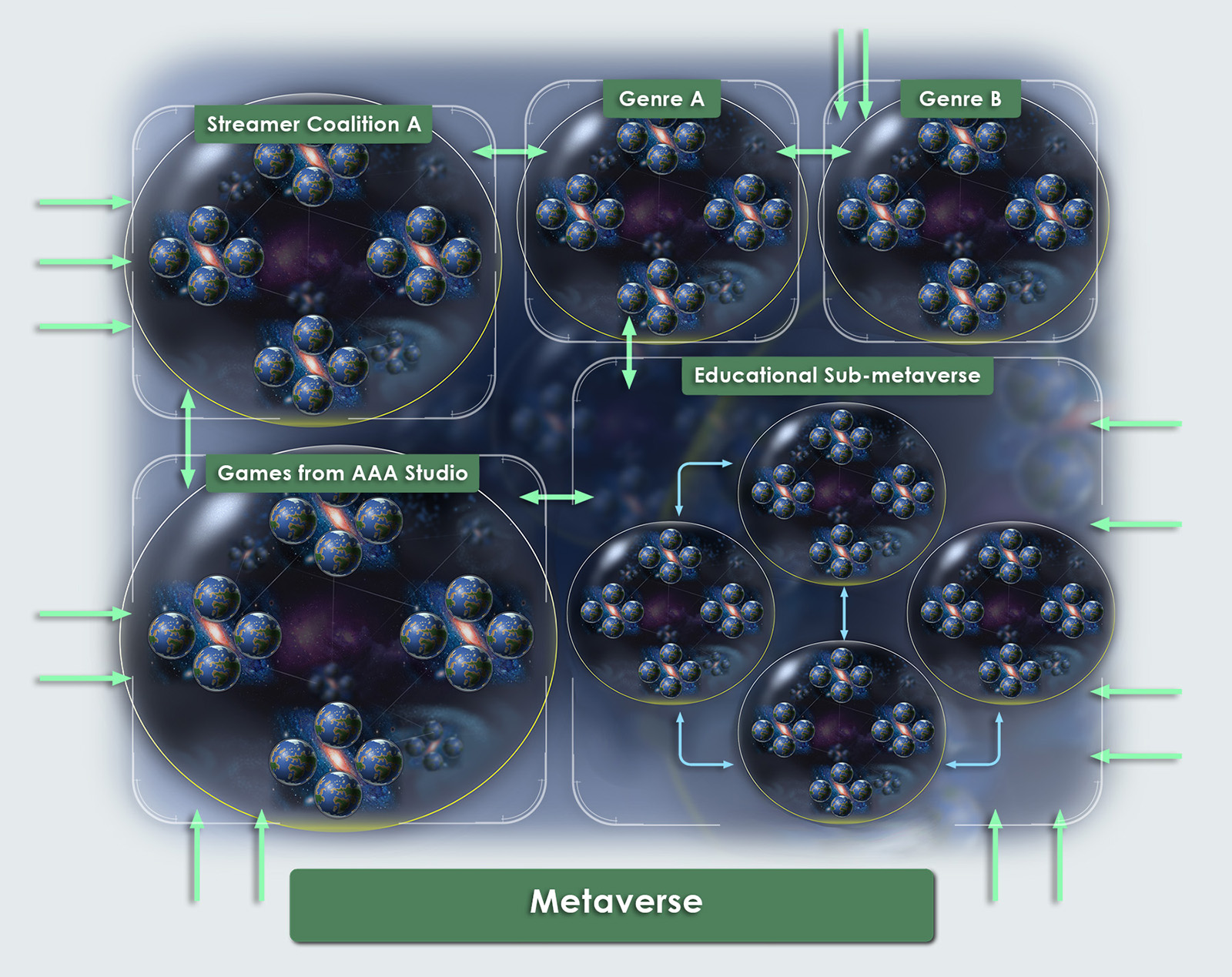 This is a metaverse grown organically from the bottom-up¸ starting not from a giant corporation offering a walled-garden where they can own and define every connection, but from individual citizens growing rich communities over time. As individual worlds grow, they connect into networks. As networks grow, they connect into multiple networks, spanning different types of games. These networks-of-networks can continue growing as well, connecting to other such entities to form triple-nested networks, with the ability to connect entirely different genres of games. That societal structure of nested settlements (towns containing Citizens, countries containing towns, federations containing countries) is extended, with as many hierarchical layers as needed, able to support any number of Citizens and worlds and games and genres.