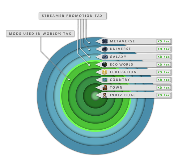 That’s a potentially large stack of taxes, but each can be microscopic and opt-in; if a Citizen doesn’t think a world’s tax relative to its value it fair, they can simply go to another world. With full transparency of pricing and percentage of tax at each level, Citizens can make informed decisions, and create competing services if they think they can create similar value themselves at a lower cost.