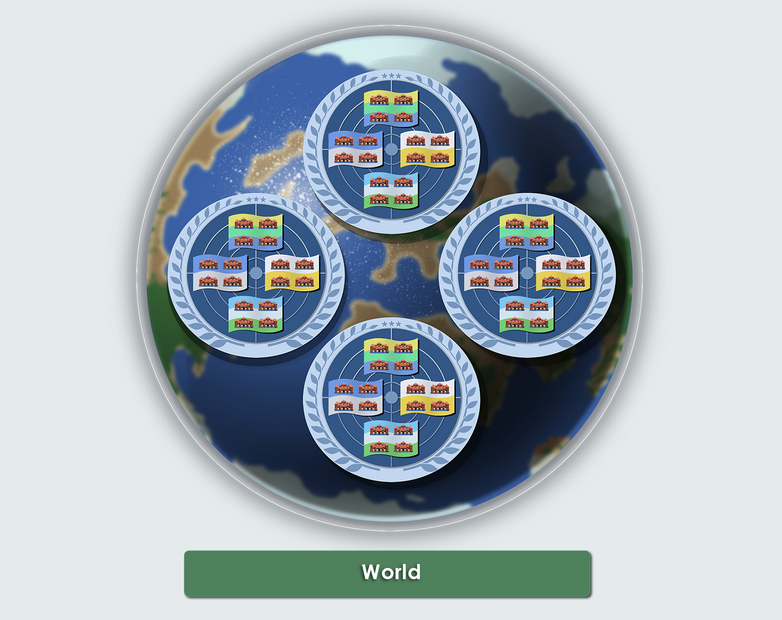 A world consisting of many federations, containing many countries each, containing many towns each, containing many citizens each. Recursive structure allows infinite scalability.