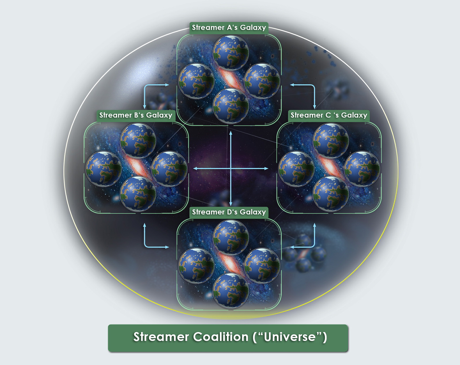 Multiple networks (aka galaxies) can be created in a 'universe', with streamers connecting multiple worlds as a key use case. The transitions between galaxies can be rigorously defined to support the type of gameplay in each gala