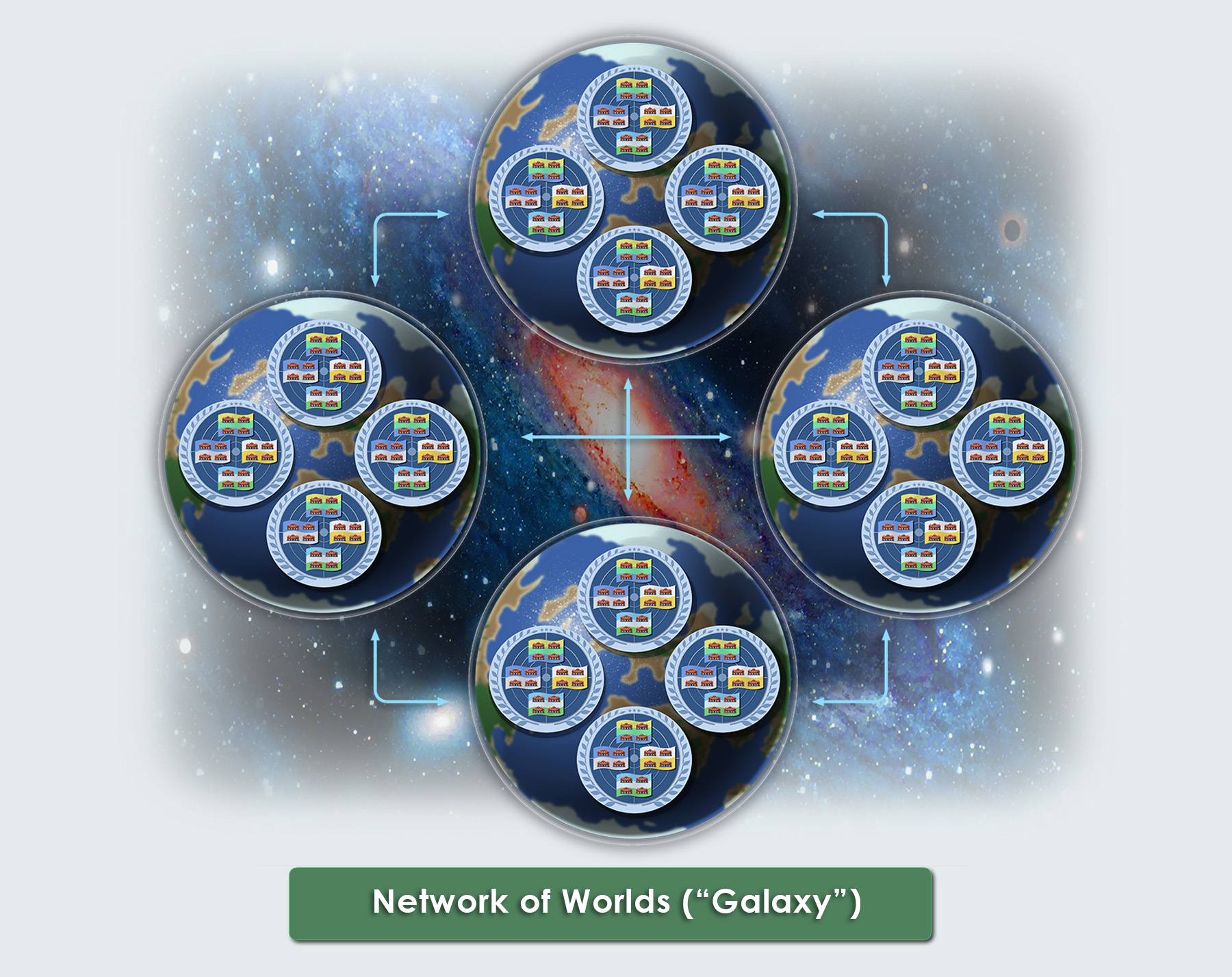 This stacking of institutions, each containing the lower level, doesn’t have to stop at the world layer. That same approach can be applied to many worlds.